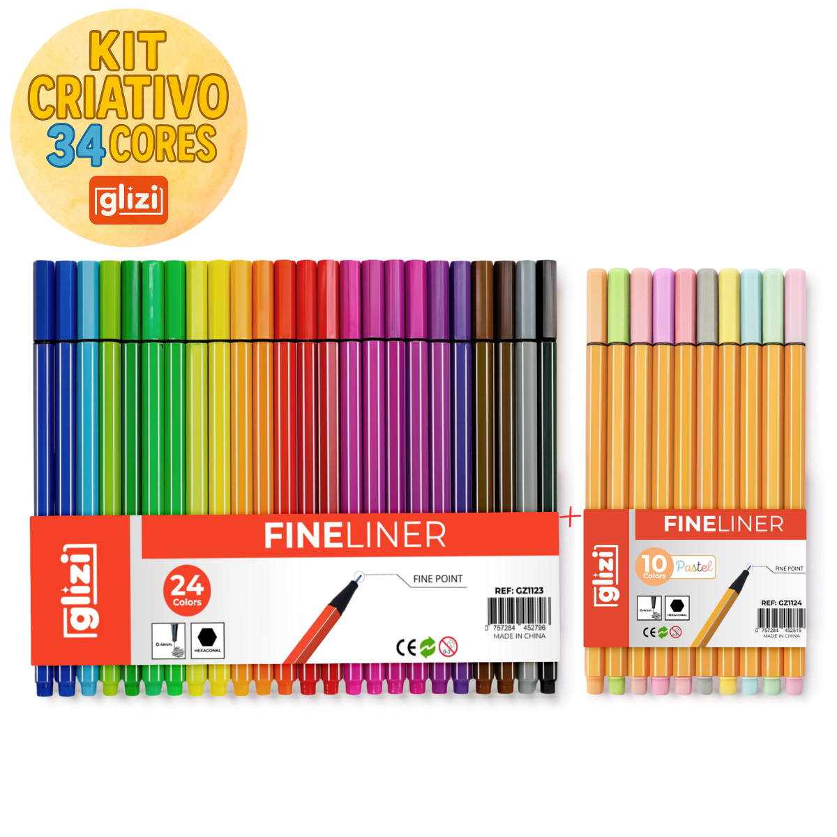 Kit exclusivo Glizi com 34 canetas Fineliner: 24 cores vivas e 10 tons pastel. Ponta fina 0.4mm para escrever, desenhar e organizar com criatividade.