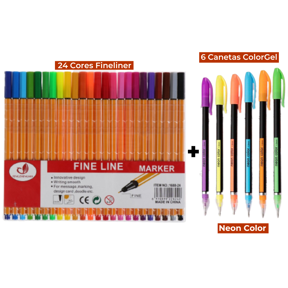 KIT COM 24 CANETAS COLORIDAS FINELINER PONTA FINA + 6 CANETAS COLORGEL NEON