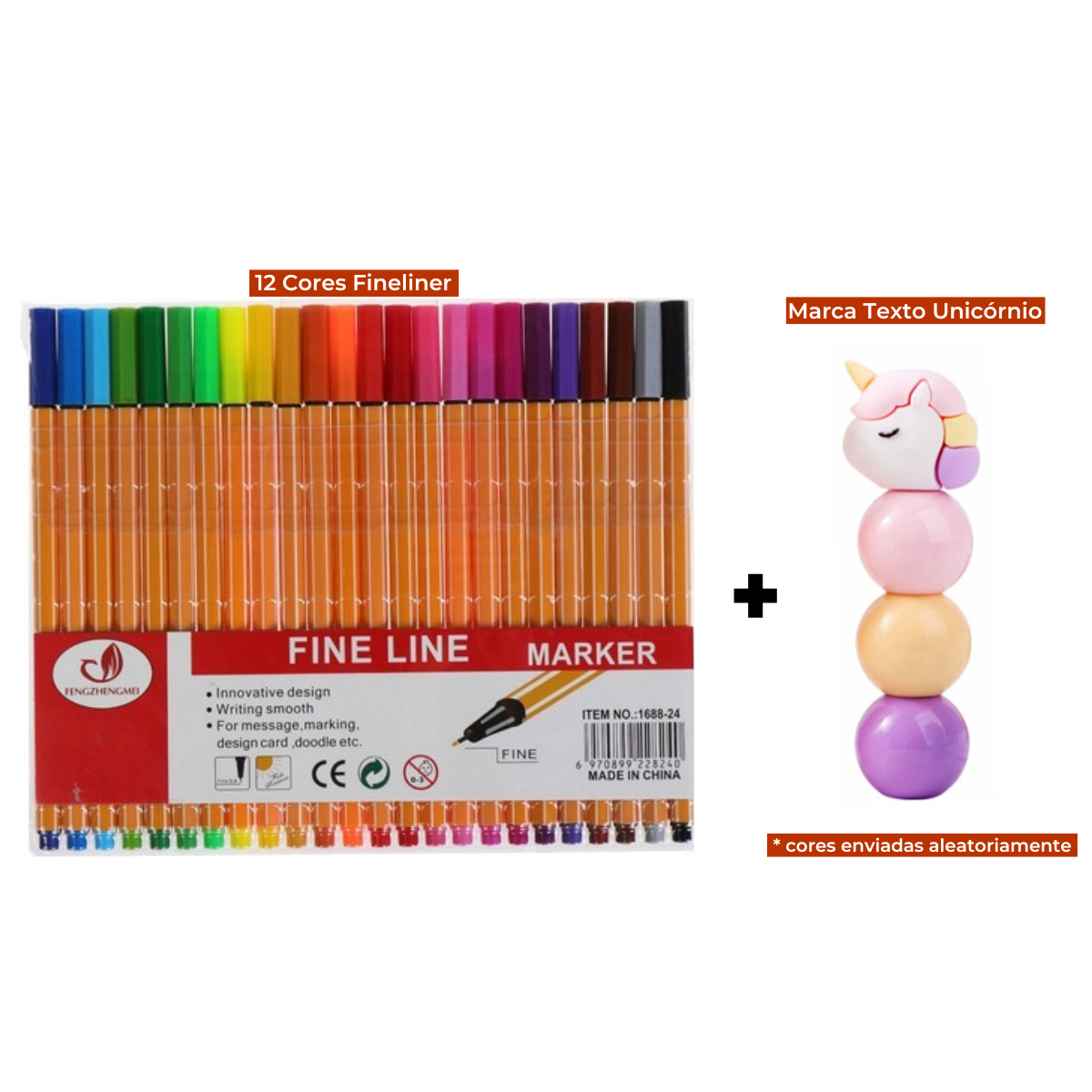 Kit 24 Canetas Fineliner Amarela + Marca Texto Unicórnio